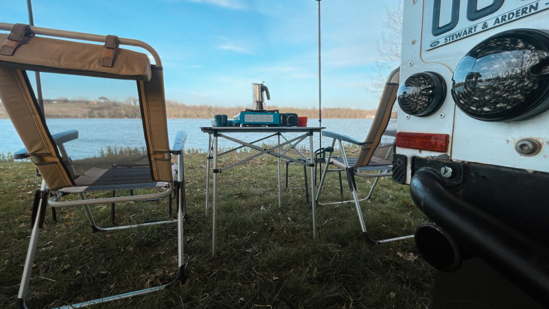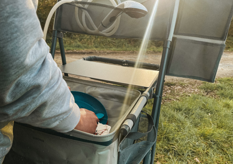 Vous trouverez à l’arrière une tablette « coin cuisine » mais également le réservoir d'eau, le réfrigérateur/congélateur (deux compartiments, idéal pour la Ben&Jerry's de cet été). Vous y trouverez également vos équipements de repos (table, chaises confort, repose pieds…). L'alimentation en eau chaude se fait via un chauffe-eau Kampa Geyser procurant de l'eau chaude instantanément: les douches deviennent bien plus agréables !