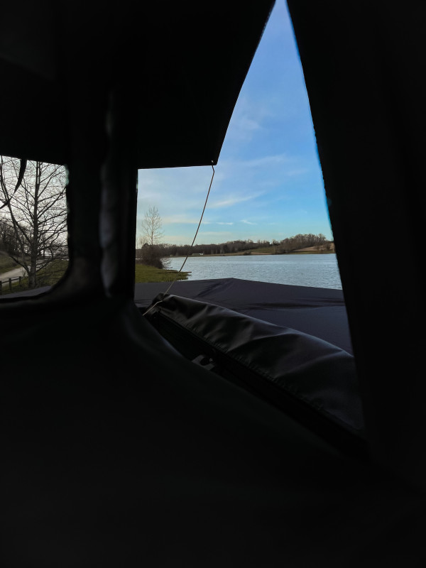 Son aménagement est plutôt simple: une configuration tiroir benne laissant place à un grand espace de rangement ainsi qu’une tente de toit alu (belle résistance au vent) toute équipée (isolation, éclairage led, anti condensation…).