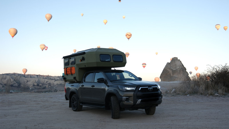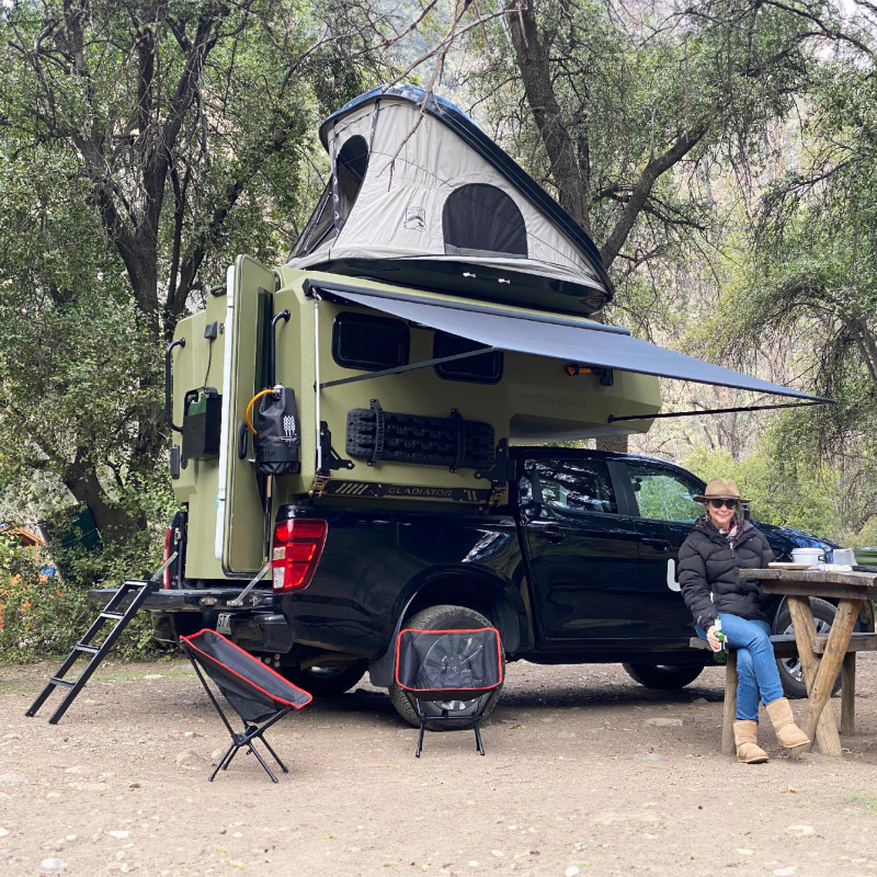 Le Gladiator Green de Uozi Campers est un Mazda BT-50 4×4 double cabine transformé en véritable maison tout-terrain. Équipé d’un moteur diesel 3,0 L de 188 ch et d’une boîte automatique, il allie puissance, confort et autonomie. Sa cellule monocoque intègre un grand lit double (ou king size), une cuisine complète avec réfrigérateur, cuisinière et évier, ainsi qu’une salle d’eau extérieure avec douche et toilettes portables. Le véhicule dispose également d’un chauffage au diesel, d’un panneau solaire, d’une batterie auxiliaire, d’eau chaude et de réservoirs d’eau propre (58 L) et d’eaux usées (23 L), garantissant un confort optimal même en pleine nature.