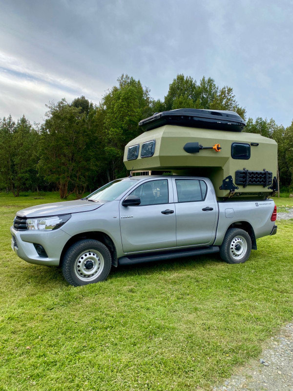 Le Gladiator Green HE est un pick-up 4×4 double cabine transformé en camping-car tout-terrain haut de gamme. Il est équipé d’une cellule monocoque offrant un espace de vie complet avec lit double ou king size, cuisine intégrée (réfrigérateur, évier, plaque de cuisson), chauffe-eau, douche et toilettes portables, ainsi qu’une batterie auxiliaire et un panneau solaire, pour une autonomie totale. Les réservoirs comprennent 58 L d’eau propre et 23 L d’eaux usées, garantissant un confort optimal même loin des infrastructures.