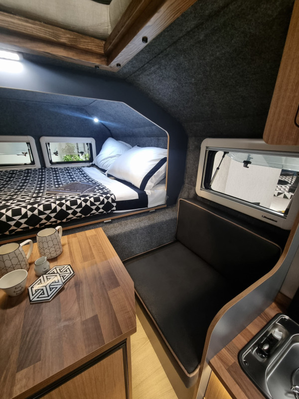 Grâce à la cellule principale et à la tente de toit, le véhicule peut accueillir cinq personnes. Pour un confort optimal, il est recommandé que ce soient deux adultes et trois enfants, afin de ne pas se sentir à l’étroit et de profiter pleinement de l’espace disponible.