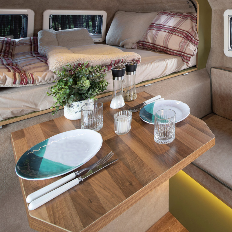 De nombreuses options supplémentaires permettent de personnaliser le véhicule selon les besoins : auvent extérieur, équipements d’aventure ou pour enfants, rangements additionnels, etc. La durée minimale de location est de cinq jours, idéale pour profiter pleinement de l’expérience sans contraintes.